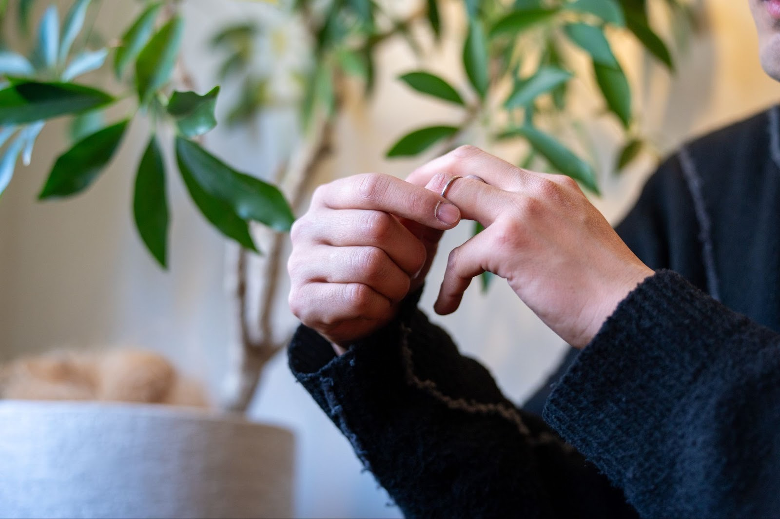 夫婦の絆の証として、左手の薬指に輝く結婚指輪。